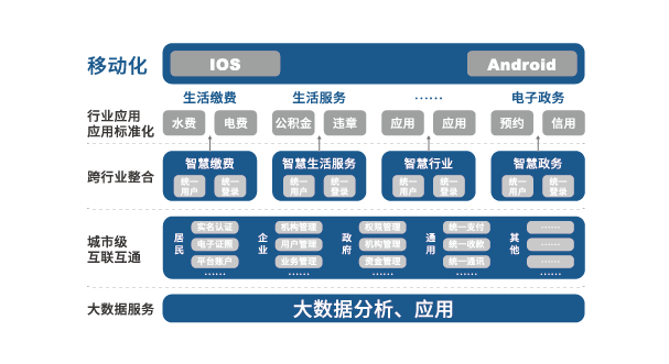 智慧城市为移动综合服务平台。平台以实名认证为基础,市民通过“智慧城市”APP即可畅享城市所有服务:如7*24小时一站式缴纳水电煤气、党费等各种生活费用,智慧社区、智慧停车、公积金社保查询等生活服务,民政互动、智慧交税、智慧消防、信用查询等政务服务,以及旅游服务、消费服务等;完整呈现智慧城市、智慧生活的当前应用与未来扩展。