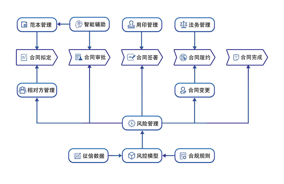 进行合同起草、审核、签署、变更、履约和法务等全周期管理,提升业务效率。